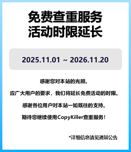 CopyKiller数据库包含9000万篇学位论文、学术论文资源和超过100亿条网页数据。